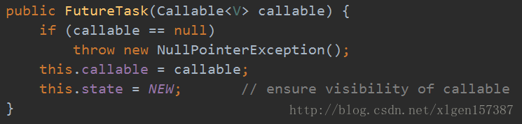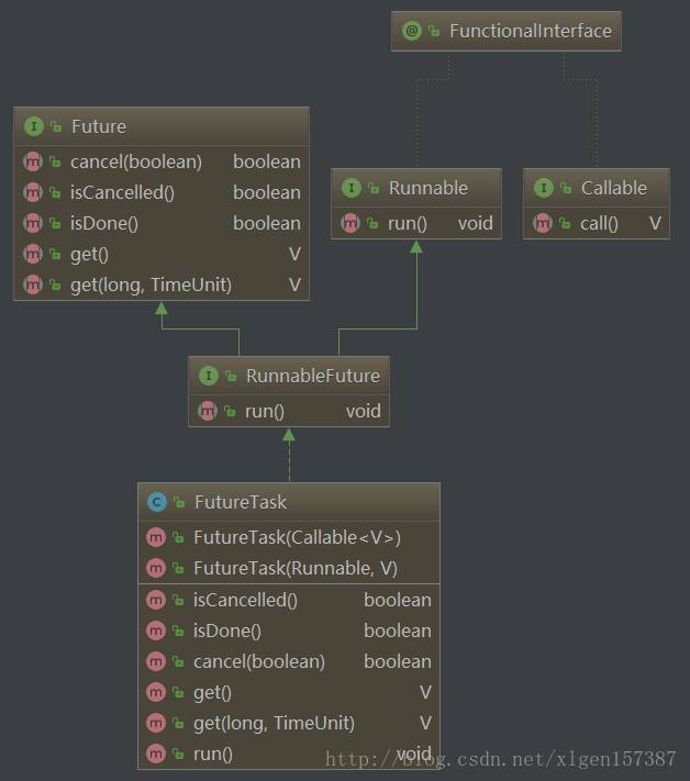 FutureTask实现了<span style="font-size: 14px">RunnableFuture</span>接口,<span style="font-size: 14px">RunnableFuture</span>接口继承了<span style="font-size: 14px">Future</span>和<span style="font-size: 14px">Runnable</span>接口。因为RunnableFuture实现了Runnable接口,因此FutureTask可以提交给Executor进行执行,FutureTask有两个构造方法,如下: