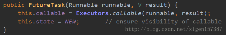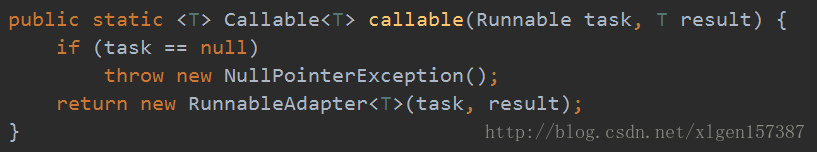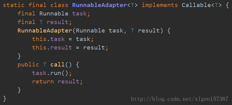 上述的第二个构造方法,传入的是Runnable接口的话,会通过<span style="font-size: 14px">Executors.callable()</span>方法转化为Callable,适配过程如下: