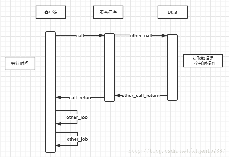 上图显示的是一个串行程序调用的流程,可以看出当有一个程序执行的时候比较耗时的时候,其他程序必须等待该耗时操作的结束,这样的话客户端就必须一直等待,知道返回数据才执行其他的任务处理。