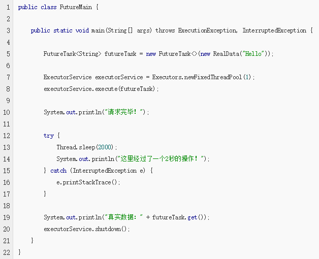 上述实现了一个简单的Future模式的实现,因为这是一个很常用的模式,在JDK中也给我们提供了对应的方法和接口,先看一下实例: