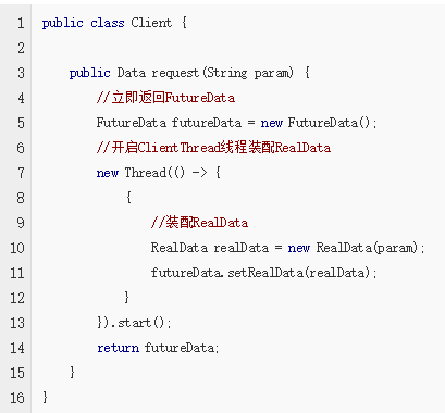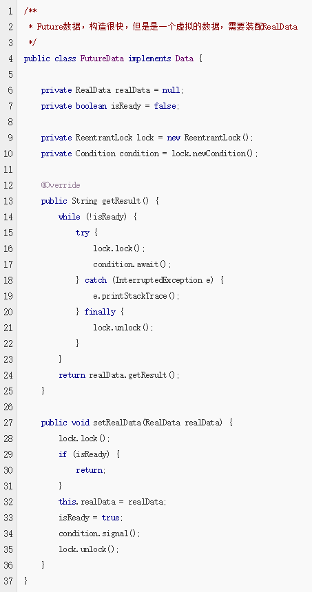 上述的流程就是说:Data为核心接口,这是客户端希望获取的数据,在Future模式中,这个Data接口有两个重要的实现,分别是:RealData和FutureData。RealData就是真实的数据,FutureData他是用来提取RealData真是数据的接口实现,用于立即返回得到的,他实际上是真实数据RealData的代理,封装了获取RealData的等待过程。
