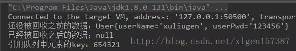 可以看到断开了user和new User()之间的引用之后,就只有弱引用了,因此,上述的那段话:都会回收掉只被弱引用关联的对象。因此该new User()会被回收。