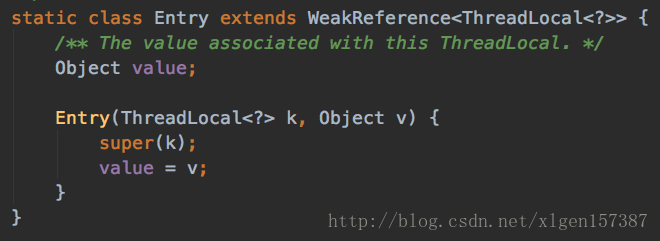 上述我们知道了当垃圾收集器工作时,无论当前内存是否足够,都会回收掉只被弱引用关联的对象。我们的ThreadLocal中ThreadLocalMap中的Entry类的key就是弱引用的,如下:
