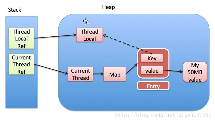 在ThreadLocal的生命周期中,都存在这些引用。( 实线代表强引用,虚线代表弱引用)