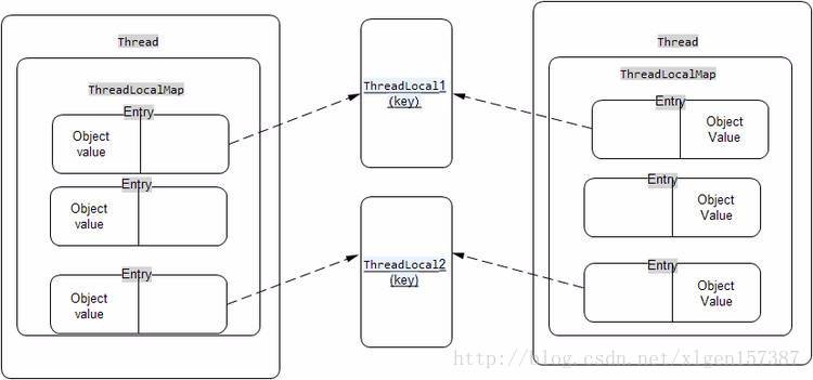 上图中描述了:一个Thread中只有一个ThreadLocalMap,一个ThreadLocalMap中可以有多个ThreadLocal对象,其中一个ThreadLocal对象对应一个ThreadLocalMap中一个的Entry实体(也就是说:一个Thread可以依附有多个ThreadLocal对象)。