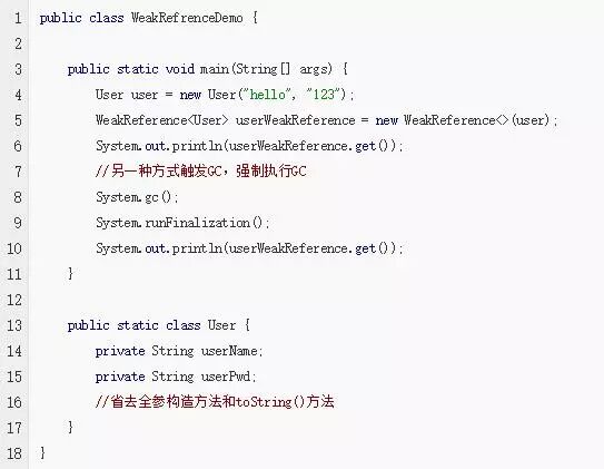 如果把上述主函数改成代码如下,将<span style="font-size: 14px">user = null</span>,则断开了他们之间的引用关系,但是还有一个弱引用userWeakReference 指向<span style="font-size: 14px">new User()</span>: