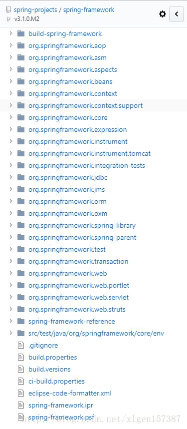 Spring在GitHub托管的代码,最早的版本只能看到Spring v3.1.0.M2(https://github.com/spring-projects/spring-framework),源码结构如下