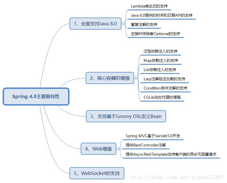 Spring 4.x全面支持Java 8.0,支持Lambda表达式的使用,提供了对@Scheduled和@PropertySource重复注解的支持,提供了空指针终结者Optional,对核心容器进行增加:支持泛型的依赖注入、Map的依赖注入、Lazy延迟依赖的注入、List注入、Condition条件注解注入、对CGLib动态代理类进行了增强。