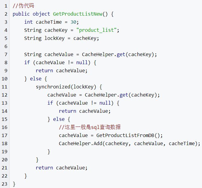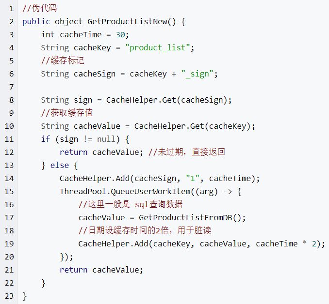 (2)还有一个解决办法解决方案是:给每一个缓存数据增加相应的缓存标记,记录缓存的是否失效,如果缓存标记失效,则更新数据缓存,实例伪代码如下: