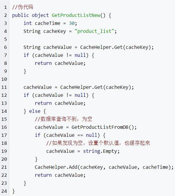 另外也有一个更为简单粗暴的方法,如果一个查询返回的数据为空(不管是数据不存在,还是系统故障),我们仍然把这个空结果进行缓存,但它的过期时间会很短,最长不超过五分钟。通过这个直接设置的默认值存放到缓存,这样第二次到缓冲中获取就有值了,而不会继续访问数据库,这种办法最简单粗暴!