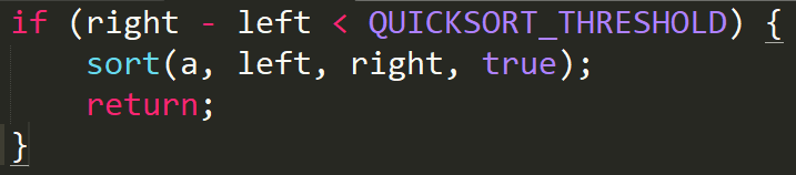发现如果数组的长度小于QUICKSORT_THRESHOLD的话就会使用这个双轴快速排序,而这个值是286。
