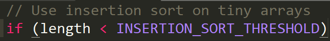 即如果数组长度小于INSERTION_SORT_THRESHOLD(值为47)的话,那么就会用插入排序了,不然再用双轴快速排序!