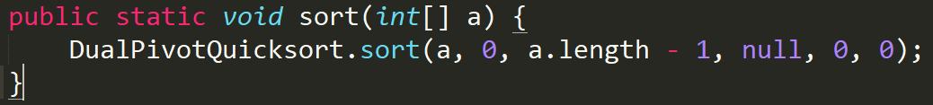 可以看到这里有一个DualPivotQuicksort,DualPivotQuicksort翻译过来就是双轴快速排序(关于双轴快速排序我们后期在讨论,可以认为是对我们普通使用的快排的一种改进,另外还有一种改进是三路快排!),再次点进去,可以发现有这么一段代码: