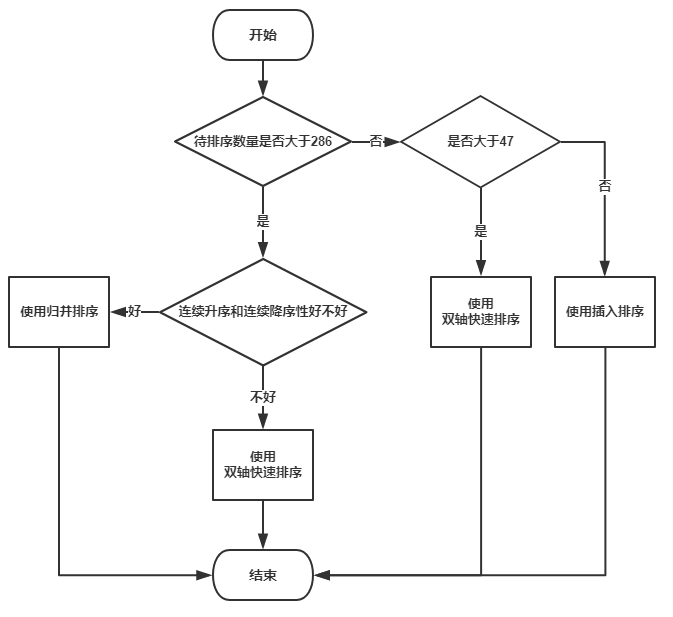总结,如果数组长度大于等于286且连续性好的话,就用归并排序,如果大于等于286且连续性不好的话就用双轴快速排序。如果长度小于286且大于等于47的话就用双轴快速排序,如果长度小于47的话就用插入排序。示意图如下: