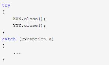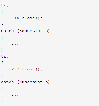 虽然有些麻烦,却能避免资源泄露。我们想,如果没有修改过的代码,万一XXX.close()抛异常了,那么就进入了catch块中了,YYY.close()不会执行,YYY这块资源就不会回收了,一直占用着,这样的代码一多,是可能引起资源句柄泄露的。而改为下面的写法之后,就保证了无论如何XXX和YYY都会被close掉。