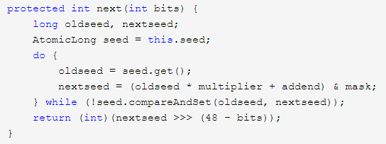 解释一下竞争同一个seed导致性能下降的原因,比如,看一下Random类的nextInt()方法实现: