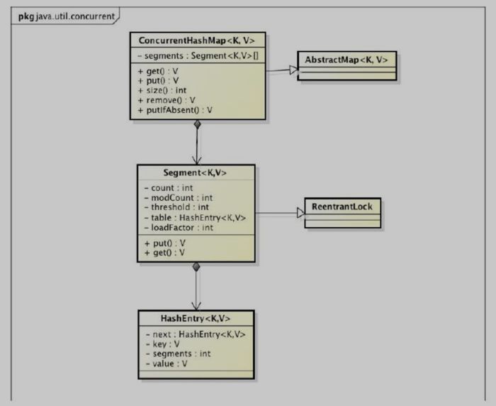 结论:ConcurrentHashMap使用的锁分段技术。首先将数据分成一段一段地存储,然后给每一段数据配一把锁,当一个线程占用锁访问其中一个段数据的时候,其他段的数据也能被其他线程访问。