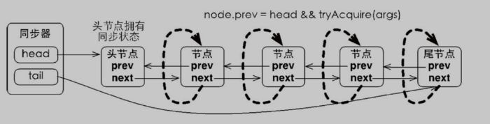 - 同步器包含两个节点类型的应用,一个指向头节点,一个指向尾节点,未获取到锁的线程会创建节点线程安全(compareAndSetTail)的加入队列尾部。同步队列遵循FIFO,首节点是获取同步状态成功的节点。