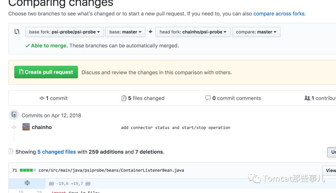 此时,可以选择要将「你的仓库」哪个分支,提交到「源仓库」的哪个分支上。此时会显示变更的文件内容,提交人等。点击绿色的「Create pull request」按钮,输入信息,完成创建 PR。