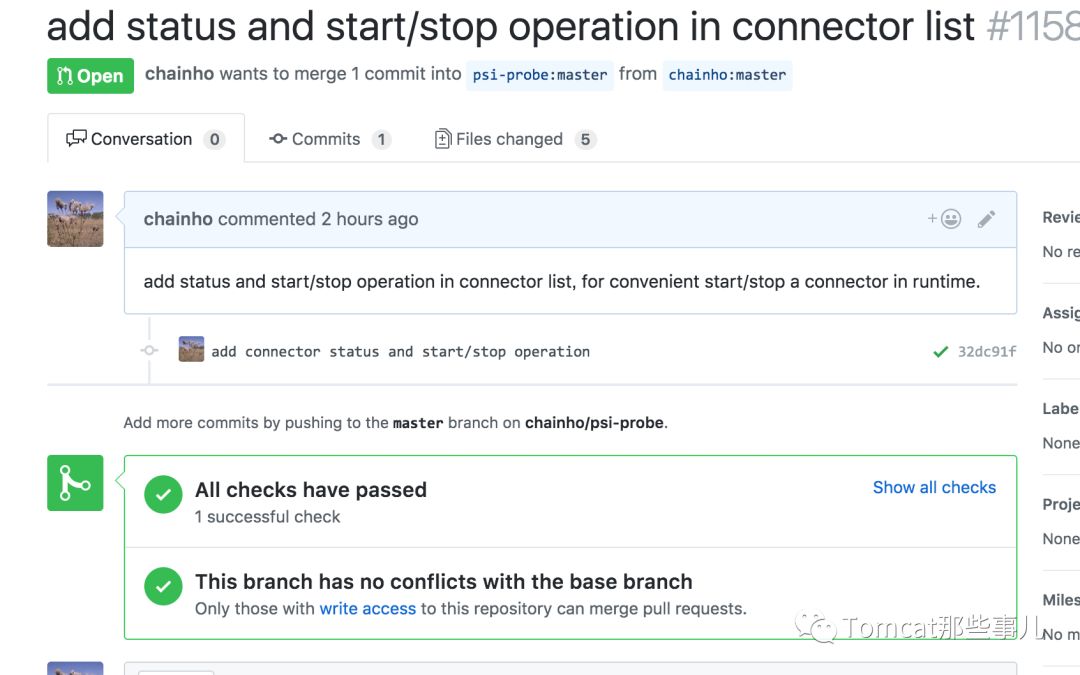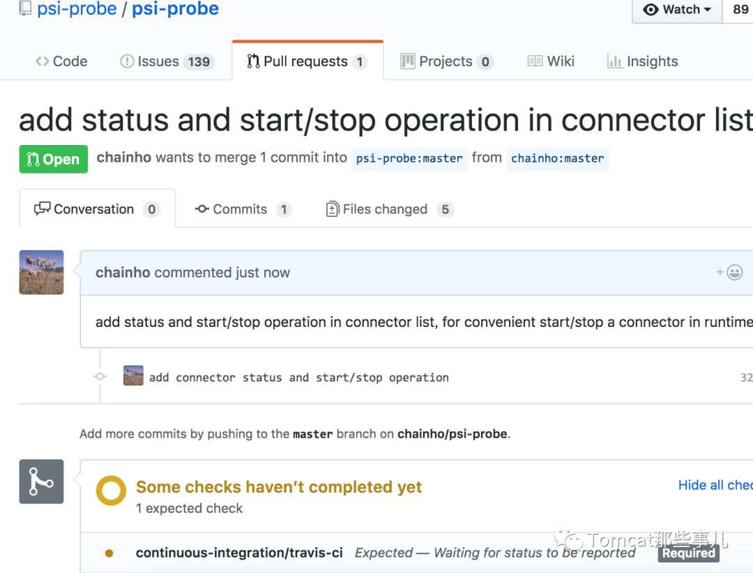 到此为止,「源仓库」的 Pull request 列表中,会显示我们刚刚发起的PR,状态是 Open,刚开始会进行一次「代码检查」与「持续集成」。