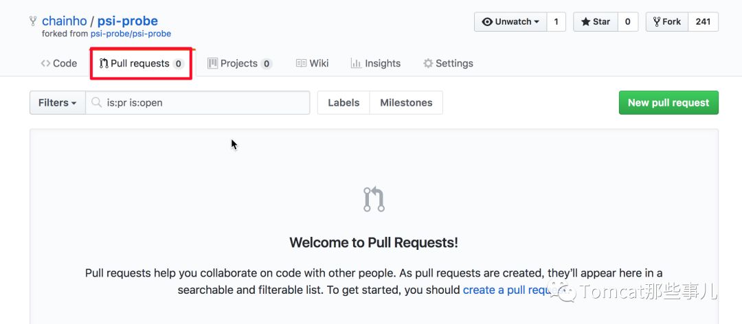 此时,在你仓库中点击「Pull Request」,会显示对于「你这个项目」,别人发起的 Pull Request。我们现在是想向「源仓库」提交代码,所以再点击右上方绿色的「New pull request」按钮。