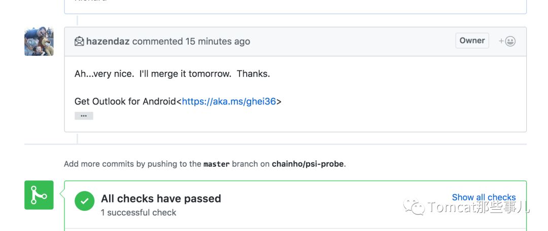 等待上述「代码检查」与「持续集成」完成,没有问题时,图标会变成绿色。此时,「源仓库」的维护人,Commiter,就可以将你提交的内容合并到源分支中。