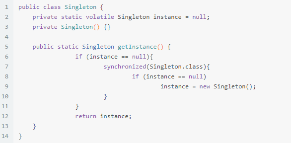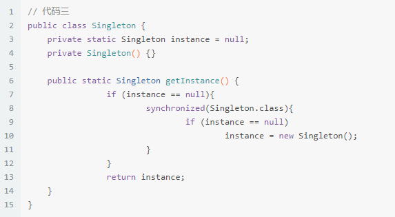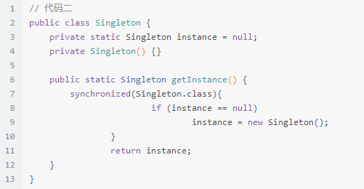 - 第一个 if(instance==null),其实是为了解决代码二中的效率问题,只有instance为null的时候,才进入synchronized的代码段大大减少了几率。