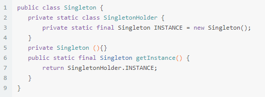 同时,由于SingletonHolder是一个内部类,只在外部类的Singleton的getInstance()中被使用,所以它被加载的时机也就是在getInstance()方法第一次被调用的时候。