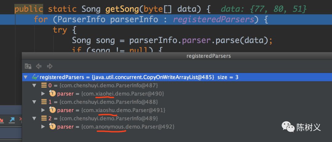 从下图我们可以得知,其实 loadInitialParsers() 方法运行之后,是将所有 Parser 接口的所有视线都放到了 ParserManager.registeredParsers 这个 List 中。