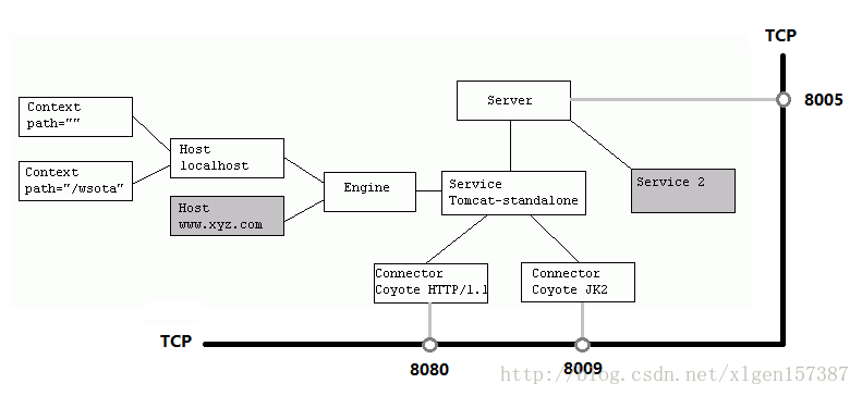 一个Tomcat中只有一个Server,一个Server可以包含多个Service,一个Service只有一个Container,但是可以有多个Connectors,这是因为一个服务可以有多个连接,如同时提供Http和Https链接,也可以提供向相同协议不同端口的连接,示意图如下(Engine、Host、Context下边会说到):