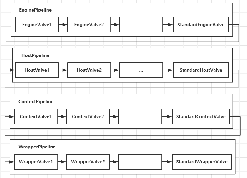 我们知道Container包含四个子容器,而这四个子容器对应的BaseValve分别在:StandardEngineValve、StandardHostValve、StandardContextValve、StandardWrapperValve。