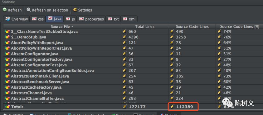 我的方法是给我的 IDE 装一个代码统计插件:Statistics。这个插件能够统计项目中的源码行数。例如下面是我统计 dubbo 项目源码的截图,它会列出每个 java 文件的源码行数,以及总共的行数。