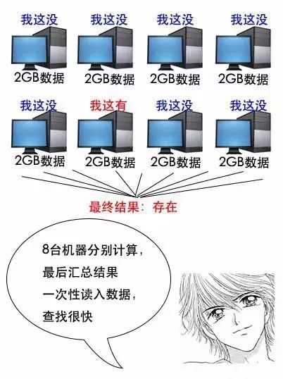 :其实面试官已经提示得比较明显了,他说给你一批机器,就是暗示你可以用分布式算法。你把数据分散在8台机器上,然后来一个新的数据,8台机器一起找,最后再汇总结果就行了。