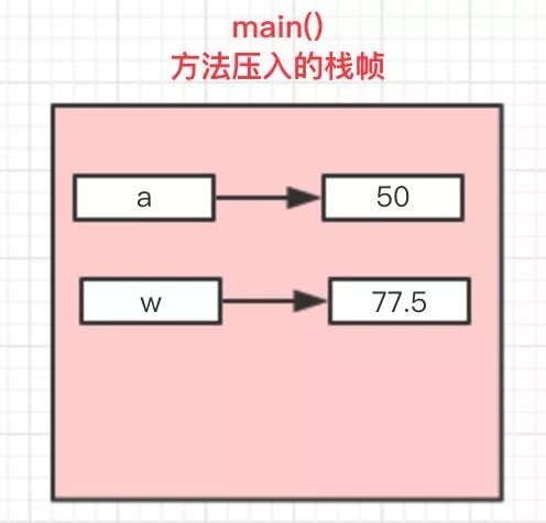 首先程序运行时,调用mian()方法,此时JVM为main()方法往虚拟机栈中压入一个栈帧,即为当前栈帧,用来存放main()中的局部变量表(包括参数)、操作栈、方法出口等信息,如a和w都是mian()方法中的局部变量,因此可以断定,a和w是躺着mian方法所在的栈帧中