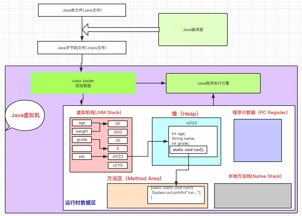 有图可以看出:Java代码被编译器编译成字节码之后,JVM开辟一片内存空间(也叫运行时数据区),通过类加载器加到到运行时数据区来存储程序执行期间需要用到的数据和相关信息,在这个数据区中,它由以下几部分组成:##### 1. 虚拟机栈