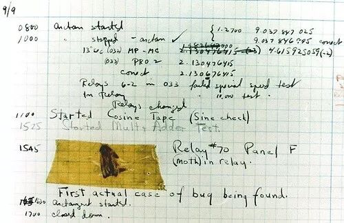 1947年9月9日,美国海军准将 Grace Hopper 在哈佛学院计算机实验室里使用 Mark II 和 Mark III 计算机进行研究工作。她的团队跟踪到 Mark II 上的一个错误,操作人员发现是由于一只飞蛾钻到了 Mark II 的继电器里导致的。团队清除了这只飞蛾,一切恢复正常。当时的工作人员记录了这样一句日志:” First actual case of bug being found. ” 这次著名的事件,犹如潘多拉打开了魔盒,从此,程序员的世界里,bug 满天飞。