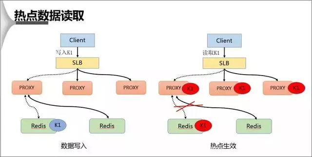 在热点 Key 的处理上主要分为写入跟读取两种形式,在数据写入过程当 SLB 收到数据 K1 并将其通过某一个 Proxy 写入一个 Redis,完成数据的写入。