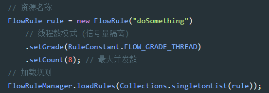 而在 Sentinel 中,信号量隔离是作为流量控制的一种模式(线程数模式)提供的,因此只需要给资源配置线程数限流规则即可: