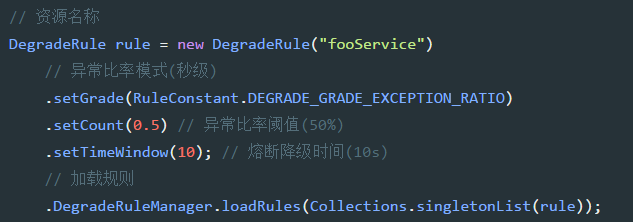 在 Sentinel 中只需要对希望自动熔断降级的资源配置降级规则即可。比如与上面 Hystrix 示例相对应的规则: