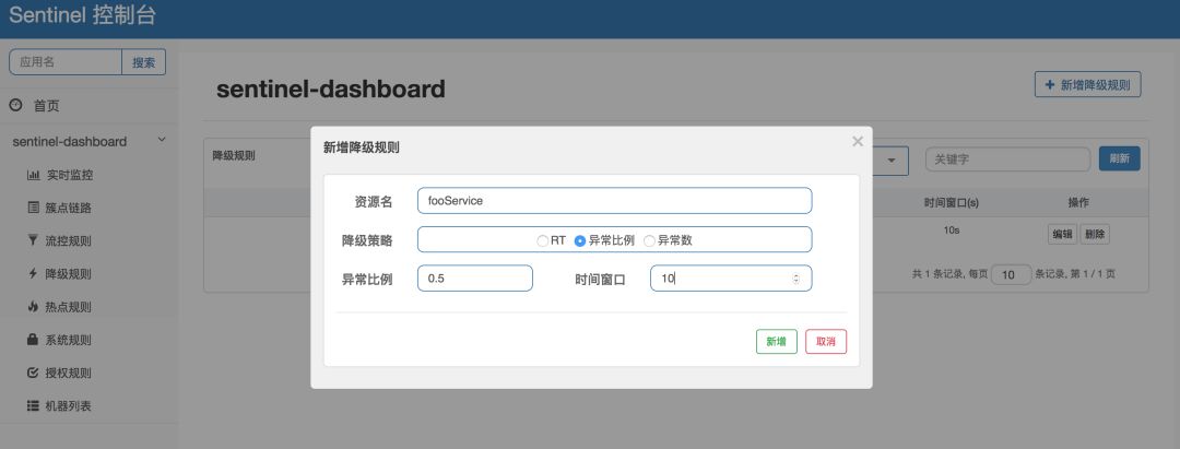 如果接入了 Sentinel 控制台,也可以在控制台上直接配置熔断降级规则。