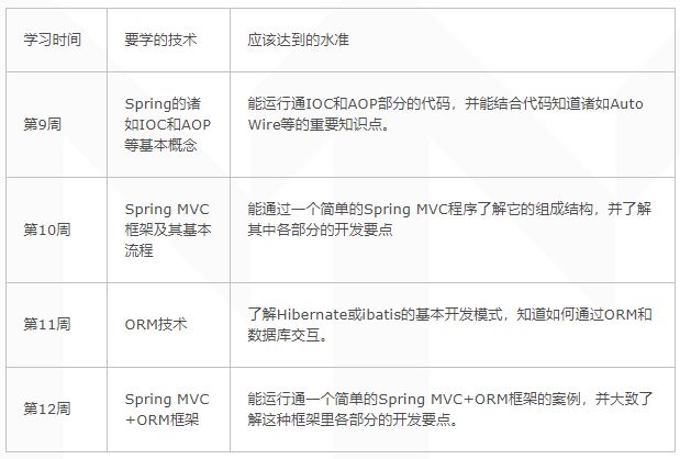 在第3个月里,大家可以深入了解Java Web里比较资深的框架技术,比如Spring MVC和ORM等,这个阶段的学习计划如下表所示。