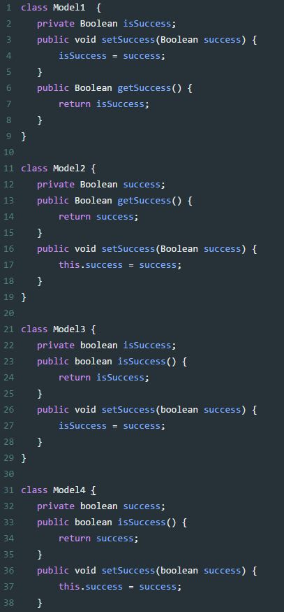 我们可以发现,虽然Model3和Model4中的成员变量的名称不同,一个是success,另外一个是isSuccess,但是他们自动生成的getter和setter方法名称都是isSuccess和setSuccess。