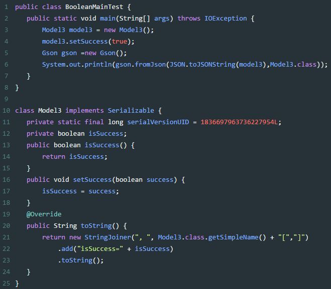 根据{"success":true}这个json串,Gson框架在通过解析后,通过反射寻找Model类中的success属性,但是Model类中只有isSuccess属性,所以,最终反序列化后的Model类的对象中,isSuccess则会使用默认值false。