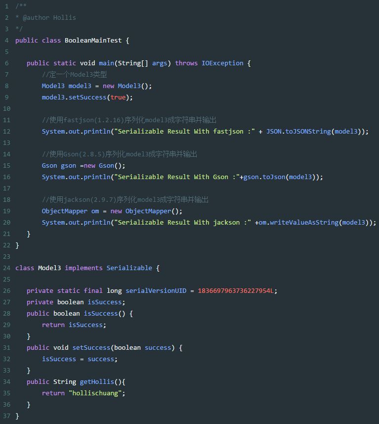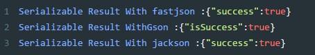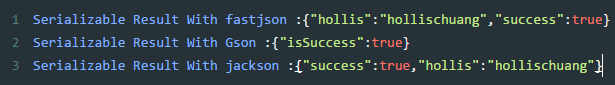 在fastjson和jackson的结果中,原来类中的isSuccess字段被序列化成success,并且其中还包含hollis值。而Gson中只有isSuccess字段。