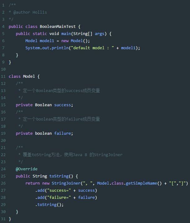 那么,到底应该是用Boolean还是boolean来给定一个布尔类型的变量呢?我们知道,boolean是基本数据类型,而Boolean是包装类型。那么,在定义一个成员变量的时候到底是使用包装类型更好还是使用基本数据类型呢?我们来看一段简单的代码: