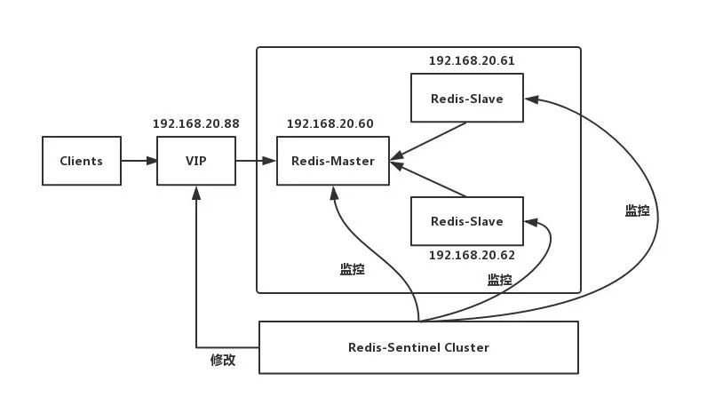 工作原理就是,当Master宕机的时候,Sentinel会选举出新的Master,并根据Sentinel中client-reconfig-script脚本配置的内容,去动态修改VIP(虚拟IP),将VIP(虚拟IP)指向新的Master。我们的客户端就连向指定的VIP即可!