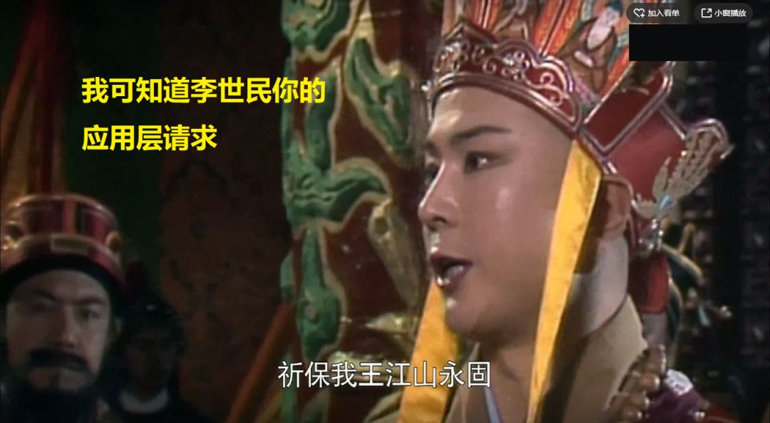 这个时候,李世民作为世俗的君王,已经想求取真经了,也就是东土大唐作为客户端,要发起对于服务端的请求了。但是玄奘法师知道,唐王李世民去取经,求的是江山永固。所以李世民的请求是应用层的,发起的是HTTP的协议,在HTTP的请求正文中,怕是写的“江山永固”四个字。