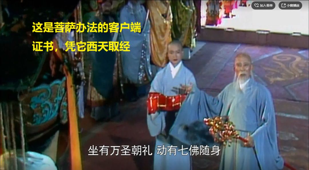 当然,一开始观音菩萨拿出锡杖和袈这个证书的时候,大家也不相信,所以需要观音菩萨现出真身,作为CA,证明给客户端,唐王李世民和玄奘法师才下拜。