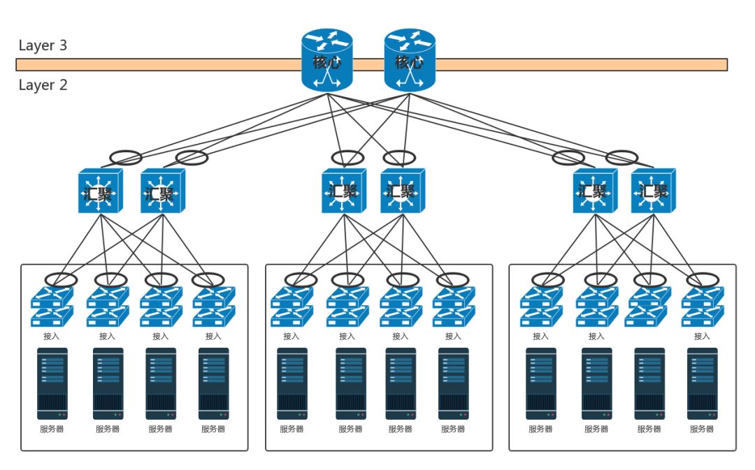 多个接入层神仙被一组汇聚层神仙(汇聚层交换机)管着,多个汇聚层的神仙被一组核心层神仙(核心交换机)管着。