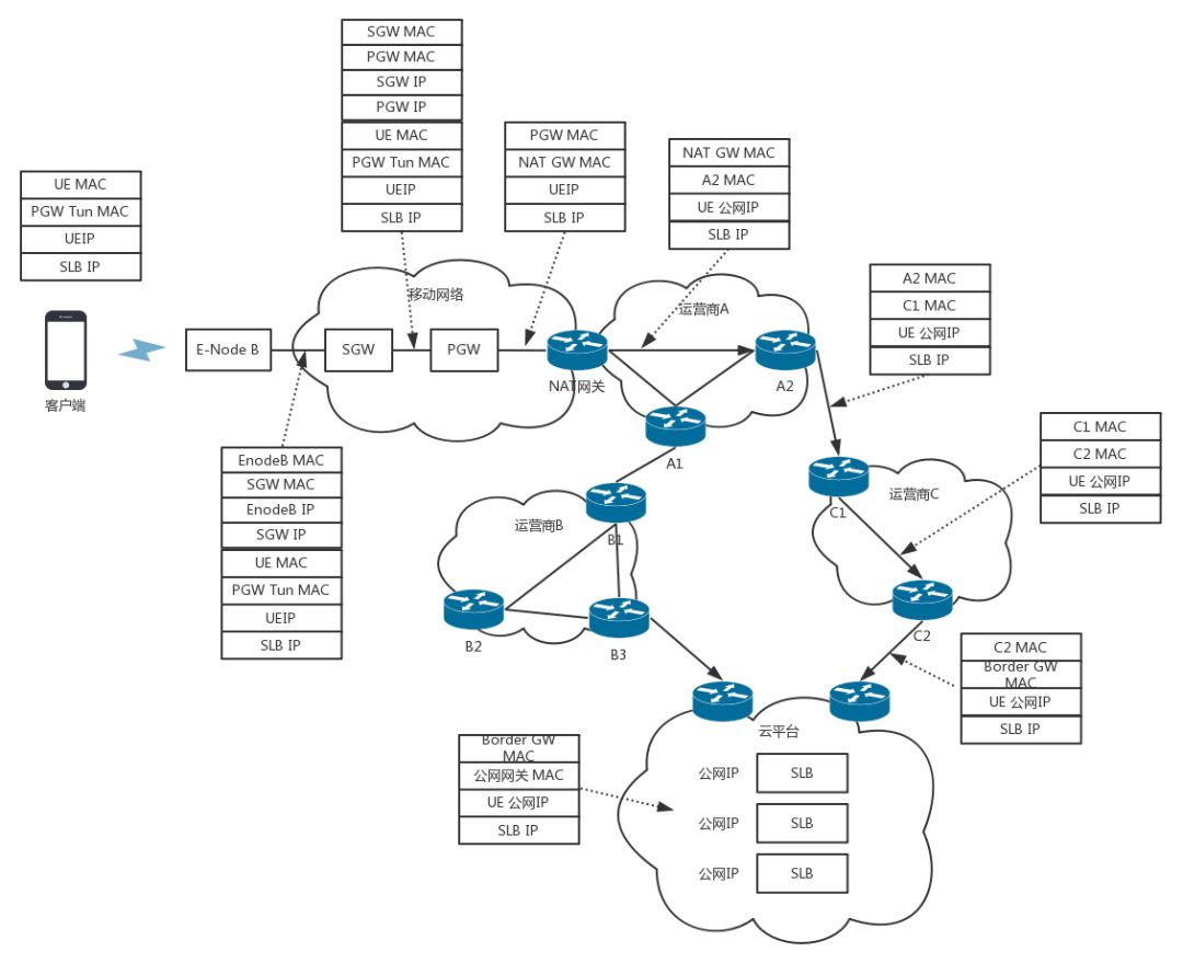 我们可以看到,手机到SLB的公网IP,是一个端到端的连接,连接的过程发送了很多包。所有这些包,无论是TCP三次握手,还是HTTPS的密钥交换,都是要走如此复杂的过程到达SLB的,当然每个包走的路径不一定一致。